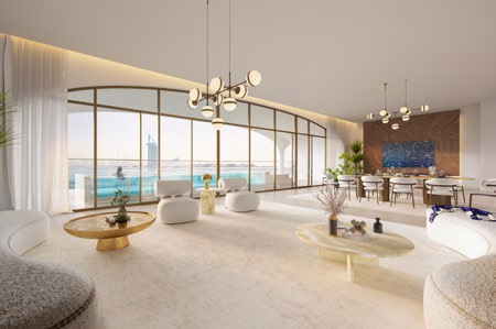 Ocean House by Ellington is a new residential project which offers residents a dreamy lifestyle in Palm Jumeirah. The residential building has a unique architectural concept, which provides optimized views from all angles. The geometry of the complex is based on a dual aspect scenario, with living spaces that benefit from the stunning views of the Burj Al Arab, the Burj Khalifa, the Dubai skyline and the sea.